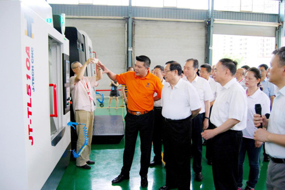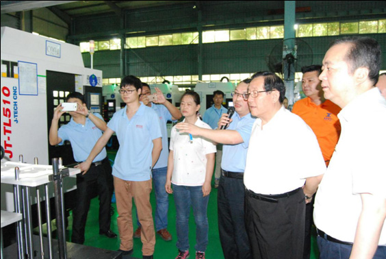 萬鋼部長(zhǎng)考察嘉泰數(shù)控實(shí)施的“智能工廠示范工程項(xiàng)目”建設(shè)成果2016年6月20日,全國政協(xié)副主席、中國科協(xié)主席、國家科技部部長(zhǎng)萬鋼和中國工程院院長(zhǎng)周濟(jì)等來自全國各地的眾多領(lǐng)導(dǎo)專家一行,在福建省常務(wù)副省長(zhǎng)張志南、泉州市委書記鄭新聰、市長(zhǎng)康濤等省市區(qū)領(lǐng)導(dǎo)的陪同下,蒞臨泉州市“數(shù)控一代”匯報(bào)現(xiàn)場(chǎng)。在洛江區(qū)智能裝備產(chǎn)業(yè)園的匯報(bào)現(xiàn)場(chǎng),嘉泰數(shù)控董事長(zhǎng)蘇亞帥就由嘉泰數(shù)控實(shí)施的“3C產(chǎn)業(yè)數(shù)字化智能工廠示范項(xiàng)目”作技術(shù)講解,以及匯報(bào)自主研發(fā)的“門型五軸立式加工中心JT-GL8-V”、高速鉆攻中心JT-TL510A以及3C產(chǎn)業(yè)智能手機(jī)金屬外殼加工自動(dòng)化生產(chǎn)線等最新成果。
