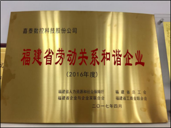 | 嘉泰數(shù)控:被授予“福建省勞動(dòng)關(guān)系和諧企業(yè)”榮譽(yù)稱(chēng)號(hào) |