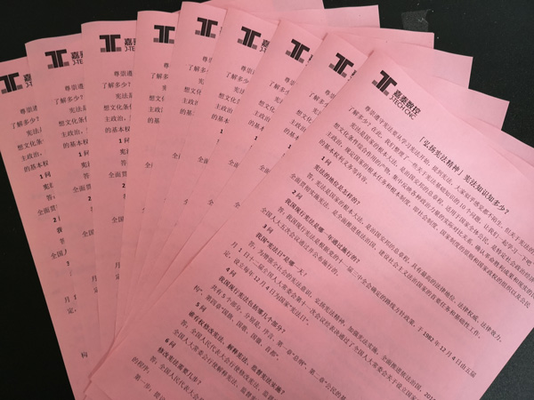 2019年12月4日是第六個(gè)國家憲法日,也是第二個(gè)“憲法宣傳周”。今年的“憲法宣傳周”以“弘揚(yáng)憲法精神,推進(jìn)國家治理體系和治理能力現(xiàn)代化”為主題,突出學(xué)習(xí)貫徹黨的十九屆四中全會精神。為深入學(xué)習(xí)貫徹落實(shí)黨的十九屆四中全會精神,弘揚(yáng)憲法精神,維護(hù)憲法權(quán)威,積極營造學(xué)習(xí)宣傳憲法的濃厚氛圍,12 月1 日-7 日,嘉泰數(shù)控開展了憲法學(xué)習(xí)的系列活動(dòng)。 為積極營造憲法學(xué)習(xí)的良好氛圍,嘉泰數(shù)控在廠區(qū)內(nèi)懸掛憲法宣傳標(biāo)語橫幅,向員工發(fā)放憲法知識傳單,組織觀看憲法宣傳片,積極傳播憲法知識,弘揚(yáng)憲法精神。憲法是治國安邦的總章程。憲法精神包含改革開放,實(shí)事求是,從實(shí)際出發(fā)的精神。企業(yè)學(xué)習(xí)憲法,既有助于提高依法治企的能力,又能幫助培養(yǎng)“工匠精神”,鼓勵(lì)員工勇于創(chuàng)新。